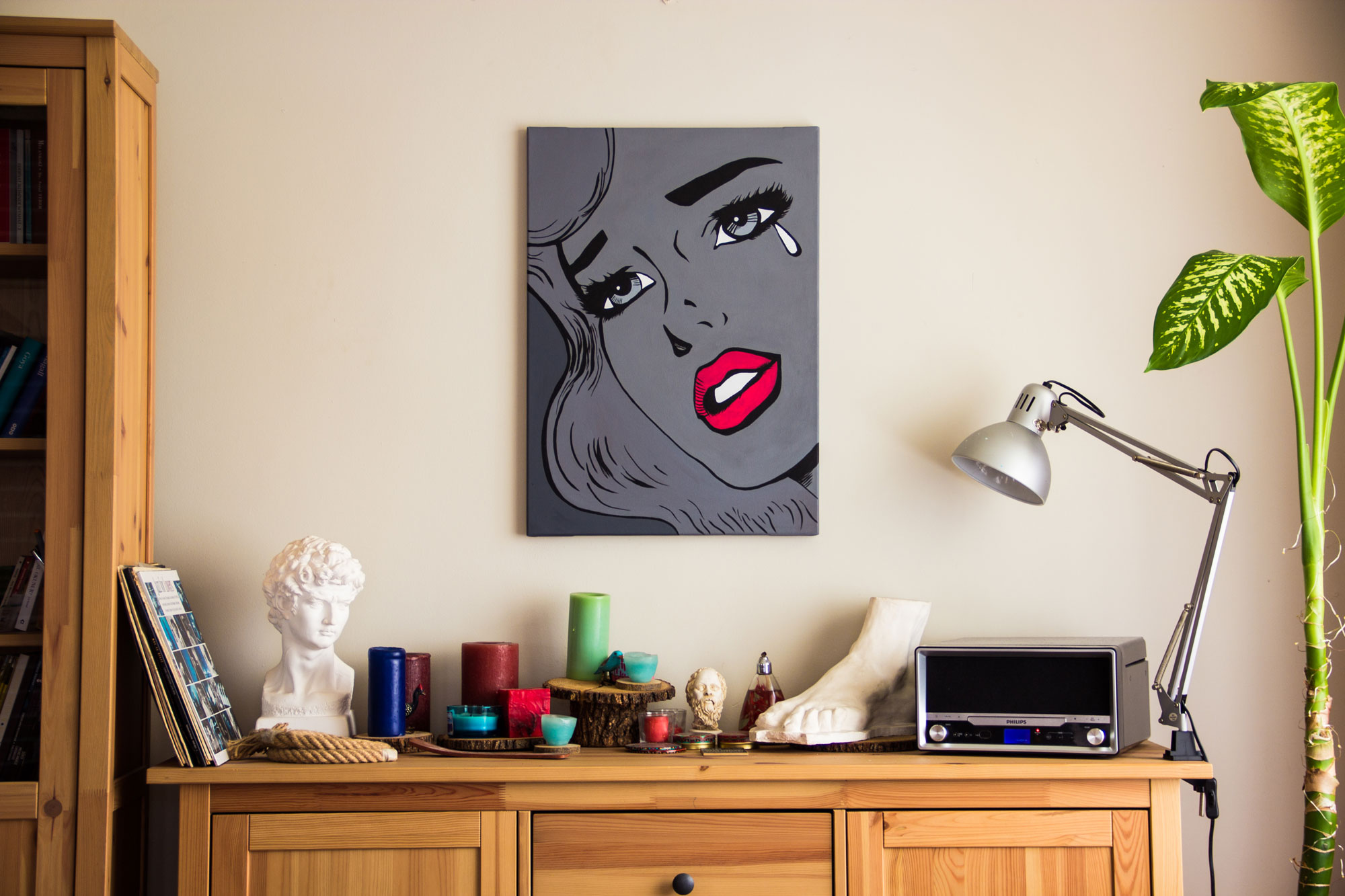 Pop art stilinde, referans görsellerden yola çıkılarak akrilik boya ile tuval üzerine hazırlanmış el yapımı bir çalışmadır.
