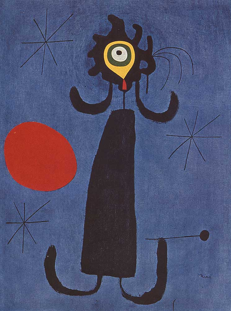 “Güneşin Önündeki Kadın” (Woman in Front of the Sun / Femme devant le soleil), Joan Miró tarafından 1938 yılında yapılmıştır. Sürrealist anlatım diliyle öne çıkan bu eser, sadeleştirilmiş figür formu, sembolik öğeler ve canlı renkleriyle Miró’nun düşsel evrenini yansıtır. Kadın figürü ve güneş motifi, yaşam enerjisi ve içsel özgürlüğün görsel bir ifadesi olarak yorumlanır. Eser günümüzde Barselona’daki Fundació Joan Miró koleksiyonunda yer almaktadır.
