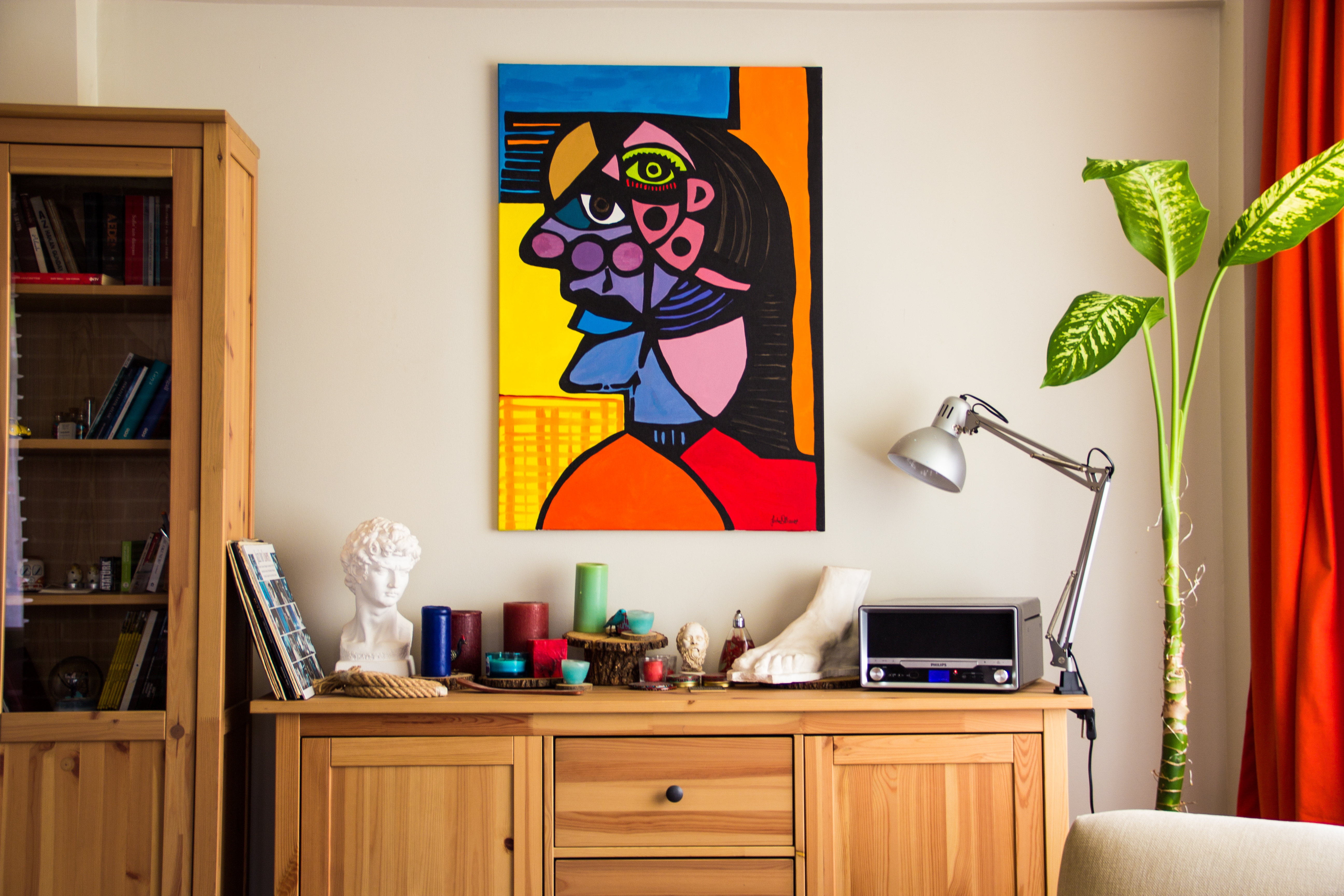 Pop art stilinde, referans görsellerden yola çıkılarak akrilik boya ile tuval üzerine hazırlanmış el yapımı bir çalışmadır.