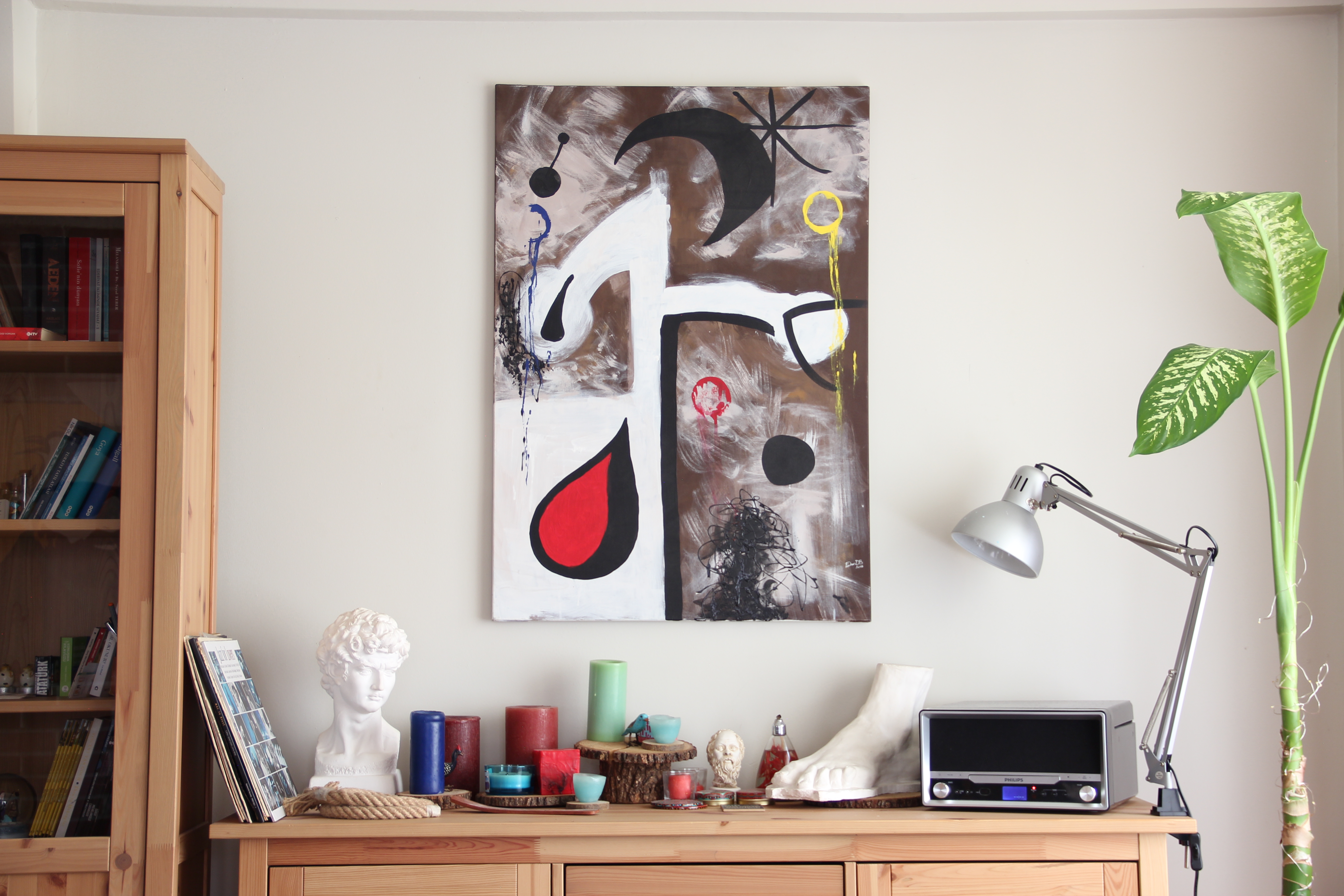 Canlı renkler ve özgün fırça dokuları sayesinde mekâna güçlü ve modern bir vurgu katar.
